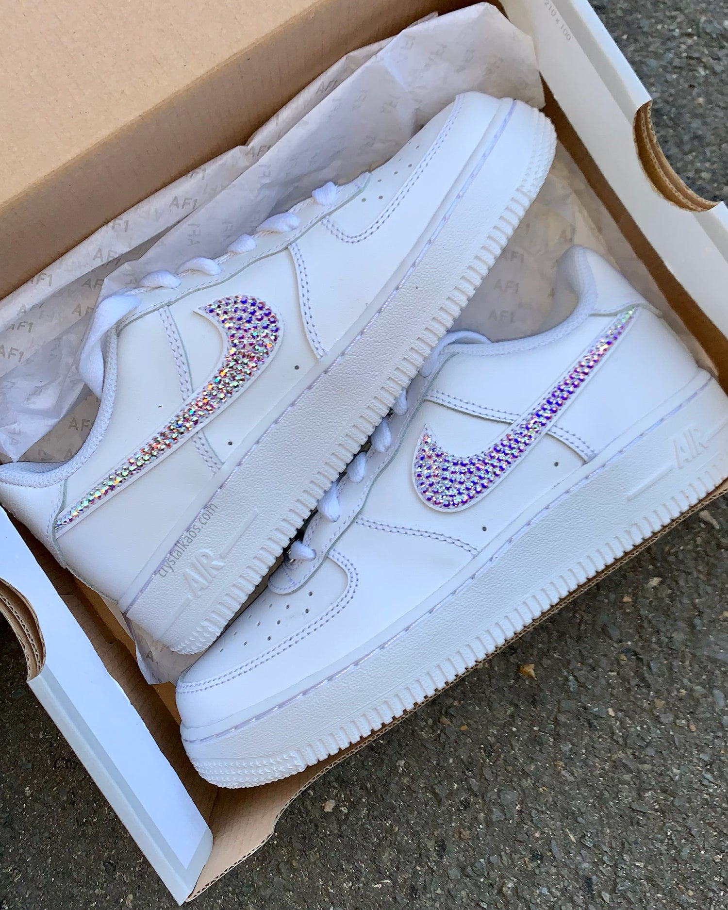 We take iconic sneaker silhouettes - Air Force 1s, Dunks, Adidas Originals - and hand set them with hundreds of sparkling glass crystals. The result? A pair that turns heads in any room, at a price that won't stop you.